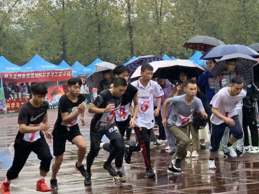 运动会上,运动员们分别在100米、400米、800米、1500米、4×100米、跳高、跳远、铅球等多个项目展开角逐,你追我赶,斗志昂扬。赛场上,运动健儿们不畏风雨、奋勇拼搏、激情洋溢,力争为学院的荣光贡献力量。萧瑟的秋风也阻挡不了他们前进的脚步,冰凉的秋雨也浇灭不了他们拼搏的激情。绿茵场上,主持人追踪播报着现场比赛进程,热情洋溢地宣读着学院递交来的加油稿;裁判员和指挥员们有条不紊地维持着比赛进程,整个比赛井然有序;学生会的工作人员辛勤地做着后勤工作,为参赛运动员提供贴心的服务。最后,运动会在4×100米接力赛的阵阵加油声和掌声中落下帷幕。