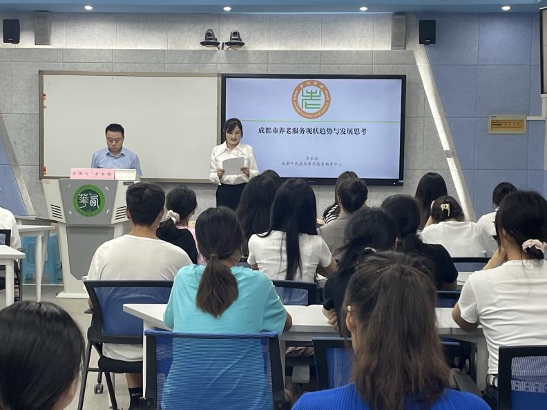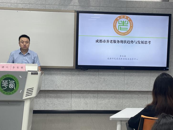 接下来,李长根通过成都市养老服务现状分享他的经验,对该问题进行更深层次的解剖,提出有效构建高质量养老服务体系的四个路径:政府保基本、家庭重责任、市场促发展、社会强支持。通过有趣生动的图片加以细致讲解,同学们对当下就业环境以及发展方向有了更加清晰的认知·。