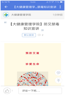 同时,我院还利用易班、QQ等网络平台,宣传有关艾滋病的知识,介绍毒品与艾滋病的关系,让每个学生都树立起“毒品猛于虎,沾了害家人”的意识,增强大家防艾禁毒的意识。