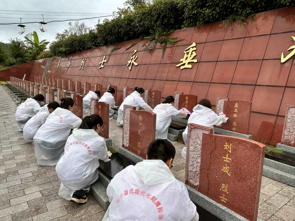 学生党员为烈士敬献鲜花与擦拭墓碑