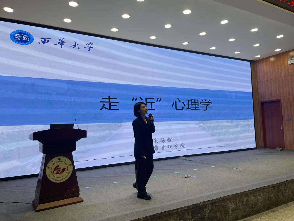 签约活动完成后,我院青年博士高海银在学术报告厅为高二年级全体学生,进行了一场题为“走‘近’心理学”的招生宣传讲座,讲座从心理学的基本课程设置、心理学发展前景以及学生心态调适等方面展开,深入浅出为全体同学领略了心理学专业的独特魅力,以及我院的办学特色与定位。
