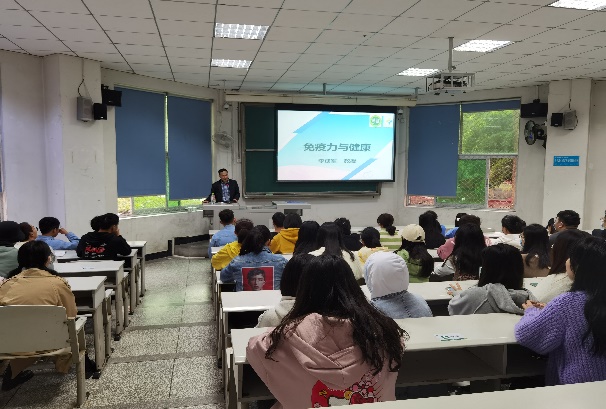 讲座上,李成军教授通过“人为什么会生病,为什么大多数人不生病?”这个问题引出本次讲座的重点:免疫力。他详细地为同学们讲解了免疫力的概念、免疫系统组成、人体免疫力的三道防线以及免疫系统的三大功能。接着,李成军教授着重介绍了影响免疫力的因素,并分析了免疫力的变化和波动的规律,从日常生活、饮食营养等方面提出了提高免疫力的方法。最后的提问环节中,同学们踊跃提问,李成军教授就同学们的问题一一进行了解答。