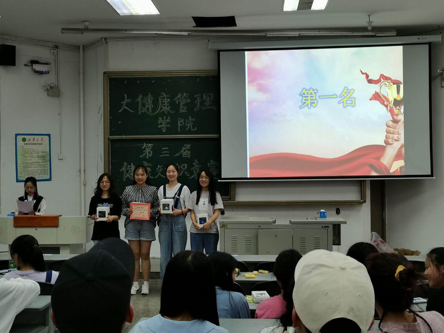 经过5月9日和15日在明德广场举行的为期两天的初赛,有8支队伍,每组队伍4人共32人进入本次决赛。比赛开始前主持人宣读了本次竞赛的赛场秩序和比赛规则,本次竞赛有三个环节,分别为必答题、抢答题和风险题。紧接着比赛正式开始,赛场上选手们积极抢答,现场气氛非常活跃。经过三个环节的比拼第一组夺得本次竞赛第一名,第六,七小组分别为第二、第三名。在赛程结束后,我们为获奖队伍和个人颁发了奖状和奖品,本次健康知识竞赛就在一次次掌声中落下了帷幕。
