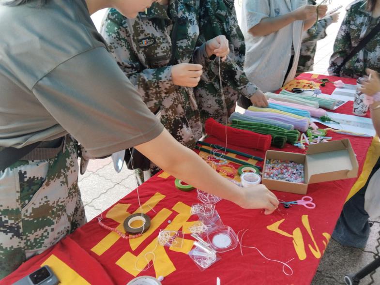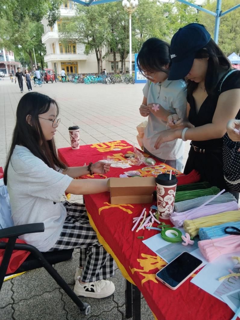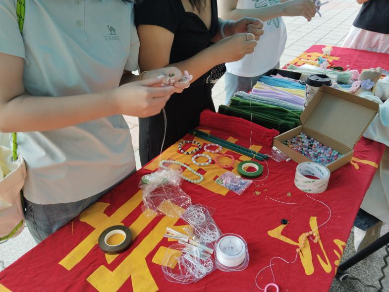 活动始,工作人员提前对现场进行了精心布置,各类五颜六色的串珠、精致挂饰等材料整齐摆放,营造出温馨活泼的创作氛围。工作人员首先为同学们详细讲解了串珠的基本制作技巧,包括选珠配色、穿线手法以及打结固定等关键步骤,并进行了现场演示。