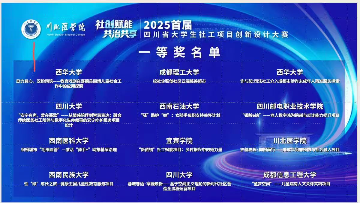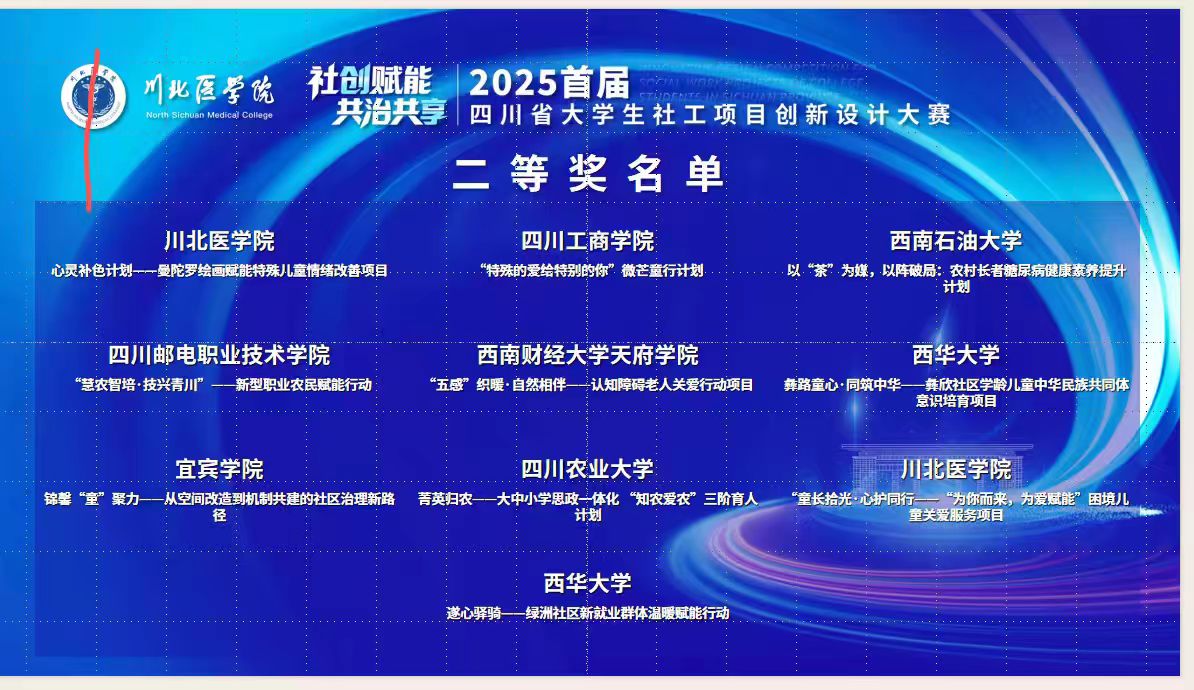 2025年11月10日,由四川省教育厅、中央四川省委社会工作部联合主办的四川省大学生社会工作创新项目大赛在南充川北医学院圆满收官。西华大学社会工作与健康管理学院四支参赛队伍,由我院熊征副院长与刘婷系主任带队,在64支决赛参赛队伍中脱颖而出,斩获2项一等奖、2项二等奖,充分展现了我校社会工作专业教育的丰硕成果与师生锐意进取的精神风貌。