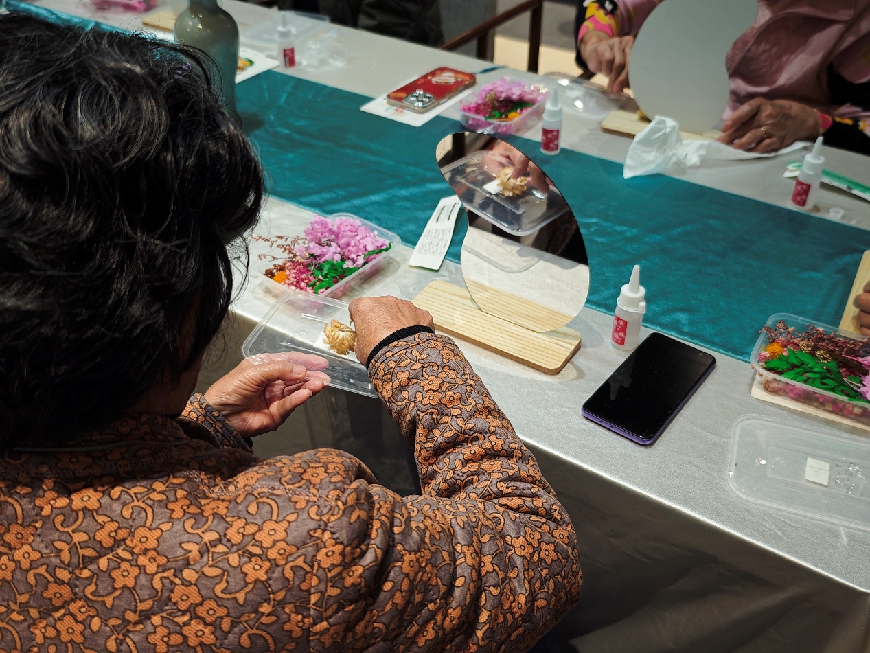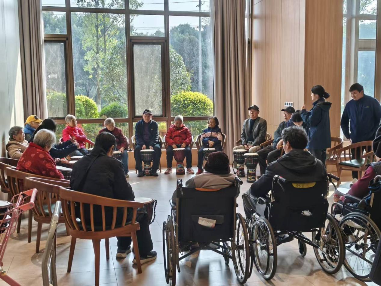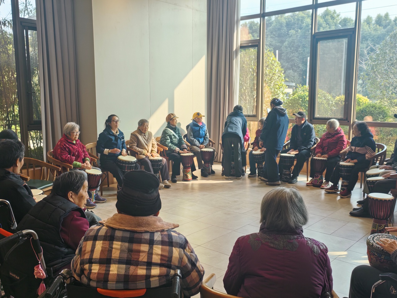 与此同时,其他同学分别参与到不同的活动课程中。非洲鼓教室内,同学们与长者们随着节拍互动,从基础击打到节奏配合,鼓声与笑声相互交织,现场氛围轻松热烈。手工活动区中,同学们与长者结对协作,密切交流,长者们分享生活经验,同学们用心倾听学习,温馨场面展现了跨代交流的独特魅力。