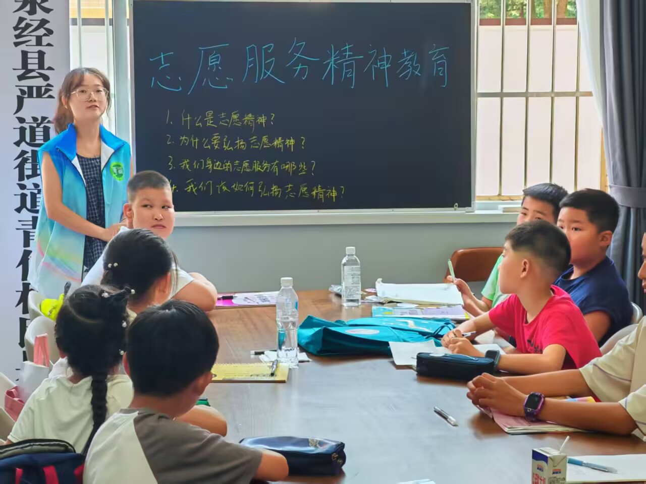 在家长信任的目光中,把他们引以为傲的孩子交到我们手中。我们不能辜负家长的期待,在五天短暂的时光中,我们以辅导为主,并在中间穿插着——志愿服务教育、红色主题服务教育、心理健康教育、美术手工、趣味游戏等。