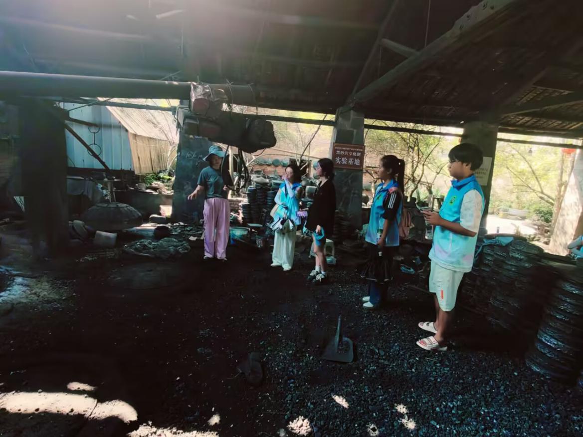 上午,志愿服务团队兵分两路,一路留下来照顾陪伴小朋友,一路微光小队步入曾家老窑。非遗传承人为我们详细介绍了形似馒头的“馒头窑”——这座亚洲升温最快的窑炉,以及烧窑时长、釉色秘密与制窑材料,让我们对制窑之道有了初步的了解。随后观摩师傅创作,解锁黑砂全工序:盘泥、拉胚、修胚、晾干、窑烧、木屑还原、冷却、打磨。经采访手艺人了解到如今的黑砂早已突破单一的制作范式,融入巧思新意的上色工艺,让器物呈现出更为丰富的面貌,既保留着泥土的本真,又契合了现代审美的多元需求,在时光的窑火中焕发着新的生机。