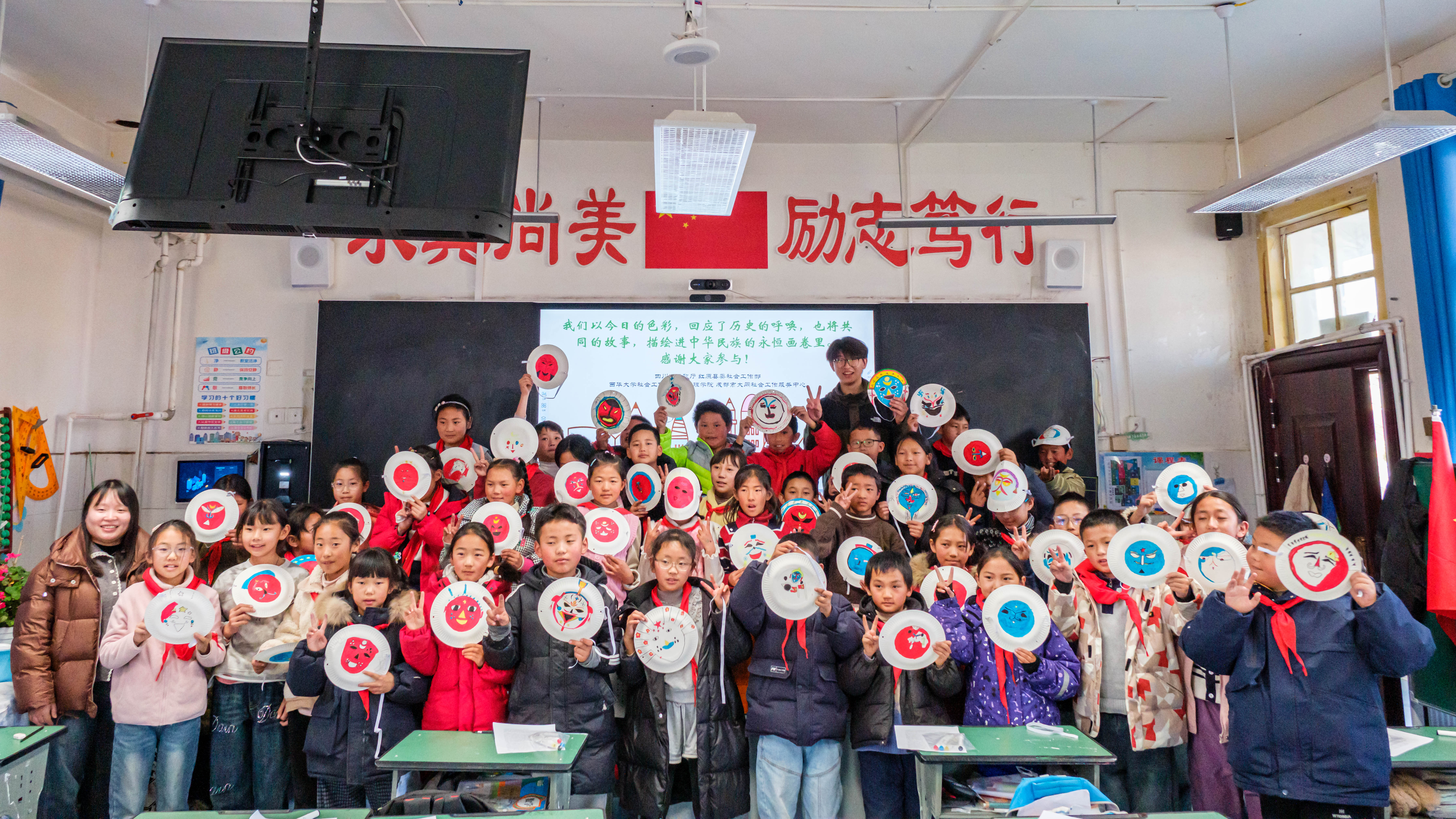 同日,西华大学社会工作专业研究生在教师指导下,联合成都大同社工开展了“小小画笔绘‘红·原’”主题实践活动。将红色文化、藏族非遗艺术与美育课程相结合,引导儿童通过绘画与面具创作理解文化交融,在实践教学中深化中华民族共同体意识教育,展现高校社会工作教育的社会服务功能。