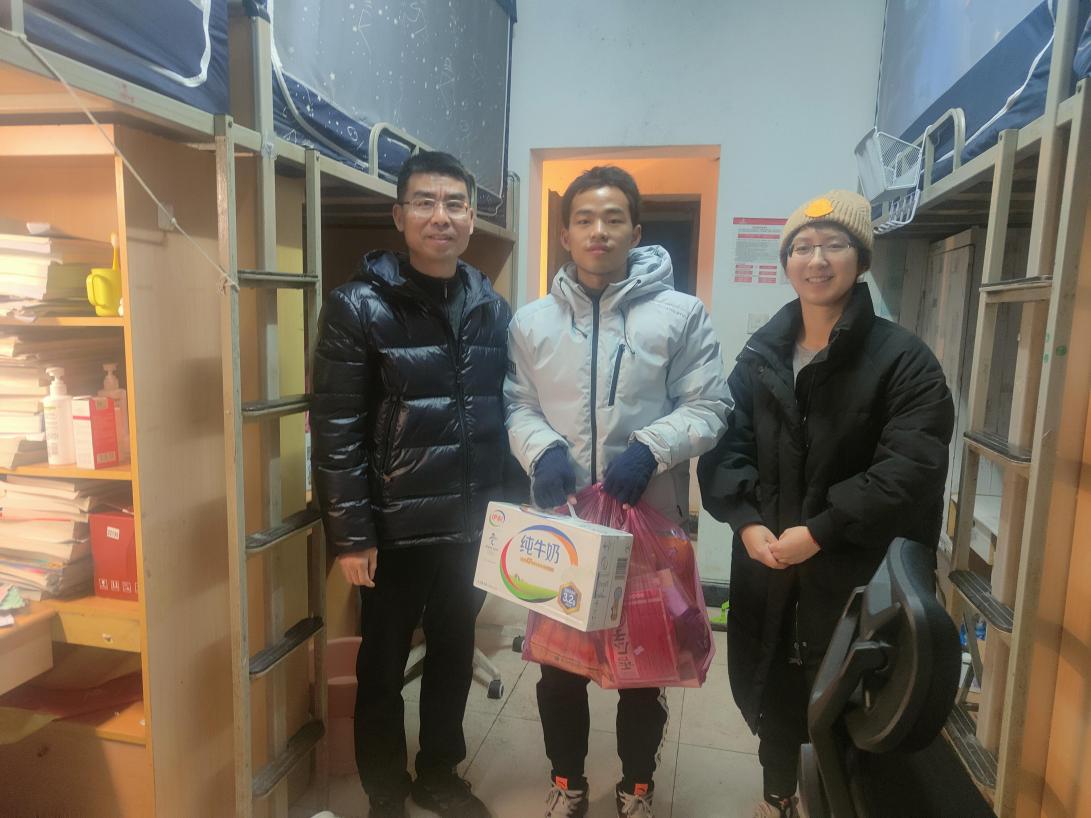 2022年1月25日,betway西汉姆联平台党总支书记王相平,学工办主任涂爽以及学院辅导员沈丛微走访学生寝室,看望慰问了春节留校学生,为同学们送去了亲切的问候和新年的祝福,并发放了慰问品。