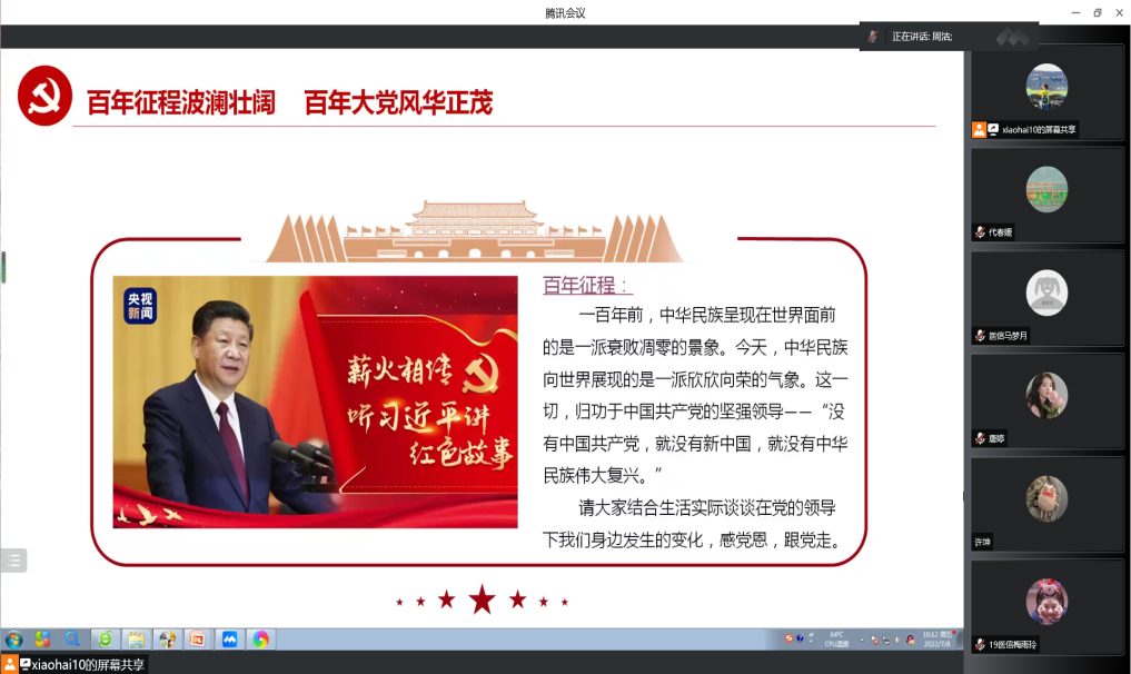 今年是中国共产党成立101周年,为深入学习贯彻习近平新时代中国特色社会主义思想,弘扬伟大建党精神,巩固和拓展党史学习教育成果,进一步提高党组织的凝聚力、战斗力和号召力,教育引导广大师生党员深刻领会“两个确立”的决定性意义,增强“四个意识”、坚定“四个自信”,做到“两个维护”,努力营造奋楫笃行、创先争优的良好氛围,以实际行动迎接党的二十大胜利召开。betway西汉姆联平台学生党支部7月7日通过线上形式开展支部书记讲党课以及主题党日活动,此次活动学院学生党支部全体党员参加。