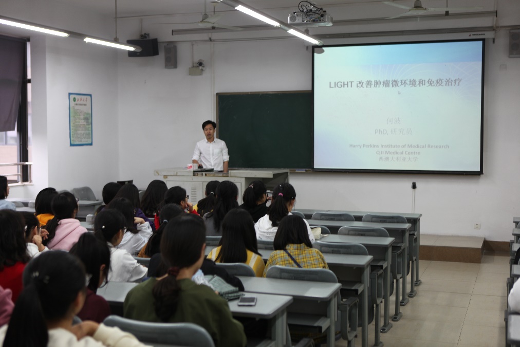 10月17日下午四点,应betway西汉姆联平台的邀请,澳大利亚大学留学博士后何波研究员在5B-403教室作了一场名为“LIGHT改善肿瘤微环境和免疫治疗”的学术报告。报告会由学院刘媛琪博士主持,学院全体老师和学生参加。